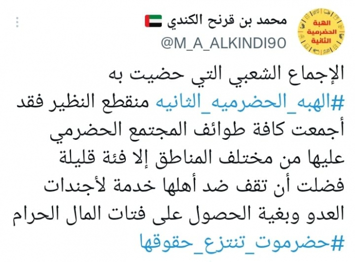 وأكد في تغريدة على حسابه بموقع التدوين المصغر تويتر، اليوم أن: "الإجماع الشعبي التي حظيت به الهبة الحضرمية الثانية منقطع النظير".