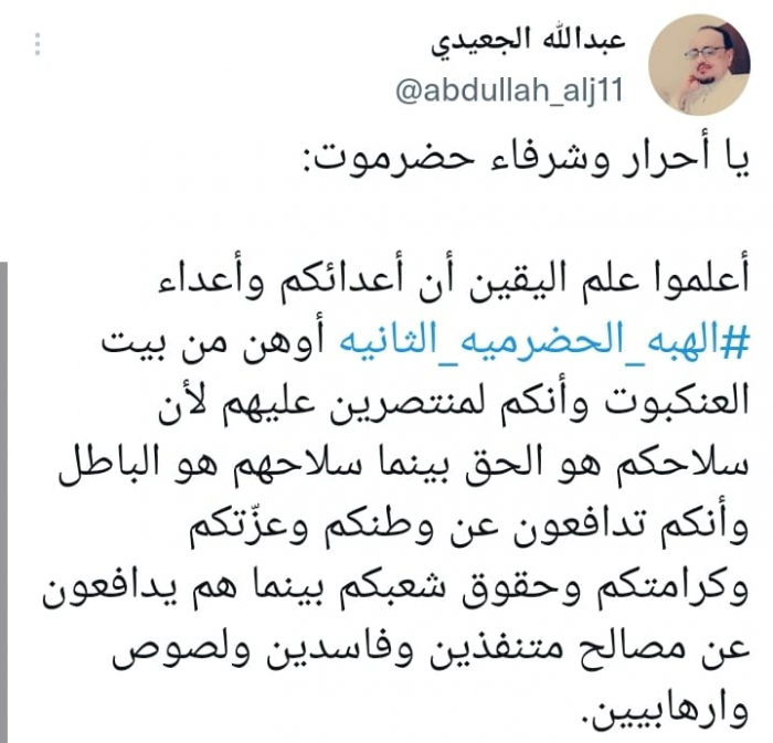 وكتب في تغريدة على حسابه بموقع التدوين المصغر تويتر، اليوم: "يا أحرار وشرفاء حضرموت: أعلموا علم اليقين أن أعدائكم وأعداء الهبة الحضرمية الثانية".