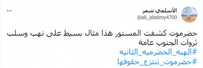 وقال في تغريدة على حسابه بتويتر، اليوم السبت إن: "حضرموت كشفت المستور"، لافتا إلى مقطع الفيديو: "هذا مثال بسيط على نهب وسلب ثروات الجنوب عامة"، متابعا: "الهبة الحضرمية الثانية وحضرموت تنتزع حقوقها".