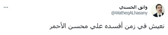 وأكد في تغريدة على حسابه بتويتر، اليوم السبت، أننا: "نعيش في زمن أفسده علي محسن الأحمر"، في إشارة إلى دوره بتجريف الجنوب من كوادره وثرواته.