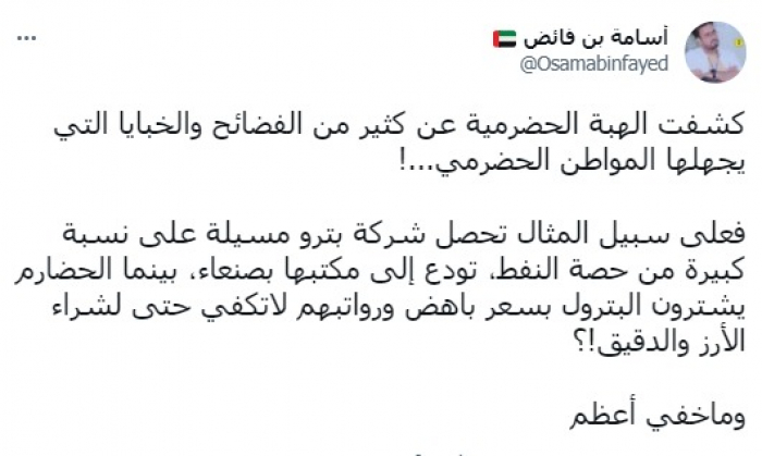 ولفت في تغريدة على حسابه بتويتر، اليوم السبت إلى أنه: "كشفت الهبة الحضرمية عن كثير من الفضائح والخبايا التي يجهلها المواطن الحضرمي".