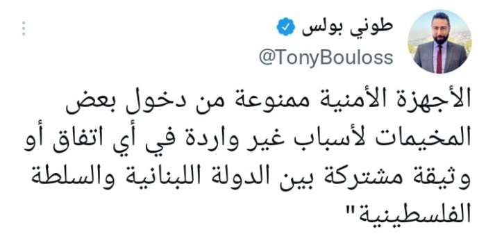 وقال في تغريدة على حسابه بموقع التدوين المصغر تويتر، اليوم إن: "الأجهزة الأمنية ممنوعة من دخول بعض المخيمات لأسباب غير واردة في أي اتفاق أو وثيقة مشتركة بين الدولة اللبنانية والسلطة الفلسطينية".