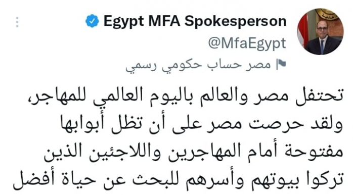 وقال في تغريدة على حسابه بموقع التدوين المصغر تويتر، اليوم إنه: "تحتفل مصر والعالم باليوم العالمي للمهاجر".