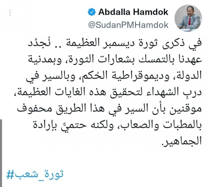 وقال في تغريدة على حسابه بموقع التدوين المصغر تويتر، اليوم إننا: "في ذكرى ثورة ديسمبر العظيمة، نُجدِّد عهدنا بالتمسك بشعارات الثورة، وبمدنية الدولة، وديموقراطية الحُكم، وبالسير في دربِ الشهداء لتحقيق هذه الغايات العظيمة".