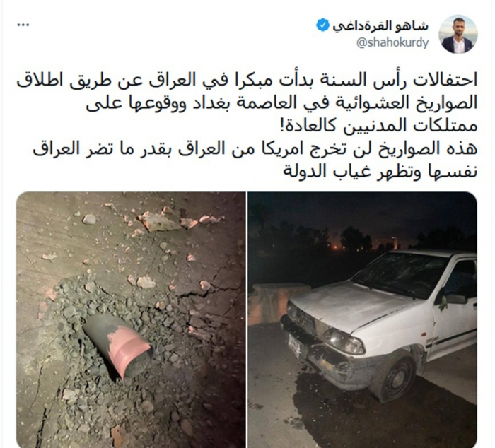وأوضح في تغريدة عبر "تويتر"، اليوم: "احتفالات رأس السنة بدأت مبكرا في العراق عن طريق إطلاق الصواريخ العشوائية في العاصمة بغداد ووقوعها على ممتلكات المدنيين كالعادة!".