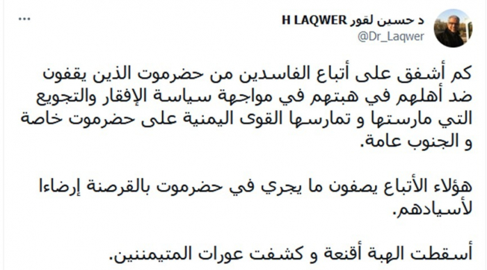 وأشار إلى أن هؤلاء الأتباع: "يصفون ما يجري في حضرموت بالقرصنة إرضاءا لأسيادهم"، لافتا إلى أن: "الهبة الحضرمية أسقطت أقنعة وكشفت عورات المتيمننين".