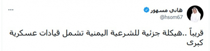 جاء ذلك في تغريدة عبر "تويتر"، اليوم، قائلا: "قريبا.. هيكلة جزئية للشرعية اليمنية تشمل قيادات عسكرية كبرى".