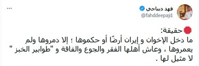 وذكر في تغريدة عبر "تويتر"، اليوم: "حقيقة.. ما دخل الإخوان وإيران أرضا أو حكموها إلا دمروها ولم يعمروها، وعاش أهلها الفقر والجوع والفاقة وطوابير خبز لا مثيل لها".