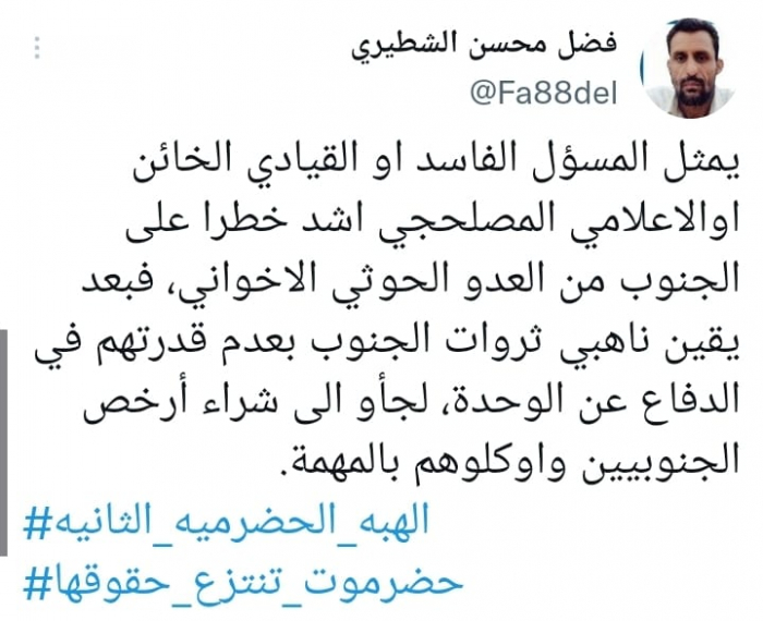 ورأى في تغريدة على حسابه بموقع التدوين المصغر تويتر، اليوم أنه: "يمثل المسؤول الفاسد أو القيادي الخائن أو الإعلامي المصلحجي أشد خطرا على الجنوب من العدو الحوثي الإخواني".