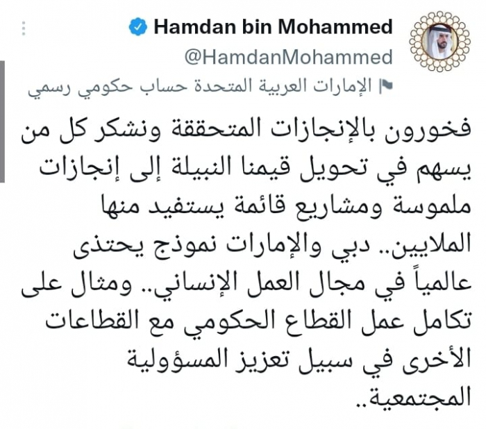 أشاد الشيخ حمدان بن محمد بن راشد آل مكتوم، ولي عهد دبي، بإنجازات دولة الإمارات العربية المتحدة في الجوانب الإنسانية على مستوى العالم، مضيفا أن هناك مشاريع إنسانية تخدم الملايين في أنحاء العالم.