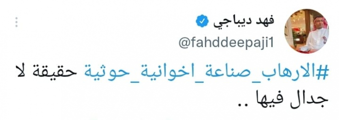 وأشار في تغريدة على حسابه بموقع التدوين المصغر تويتر، اليوم إلى أن: "الإرهاب صناعة إخوانية حوثية"، معتبرا أنها: "حقيقة لا جدال فيها".
