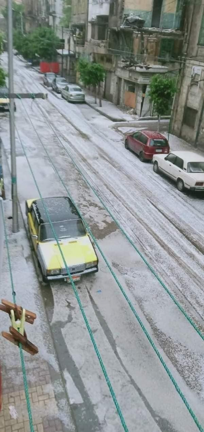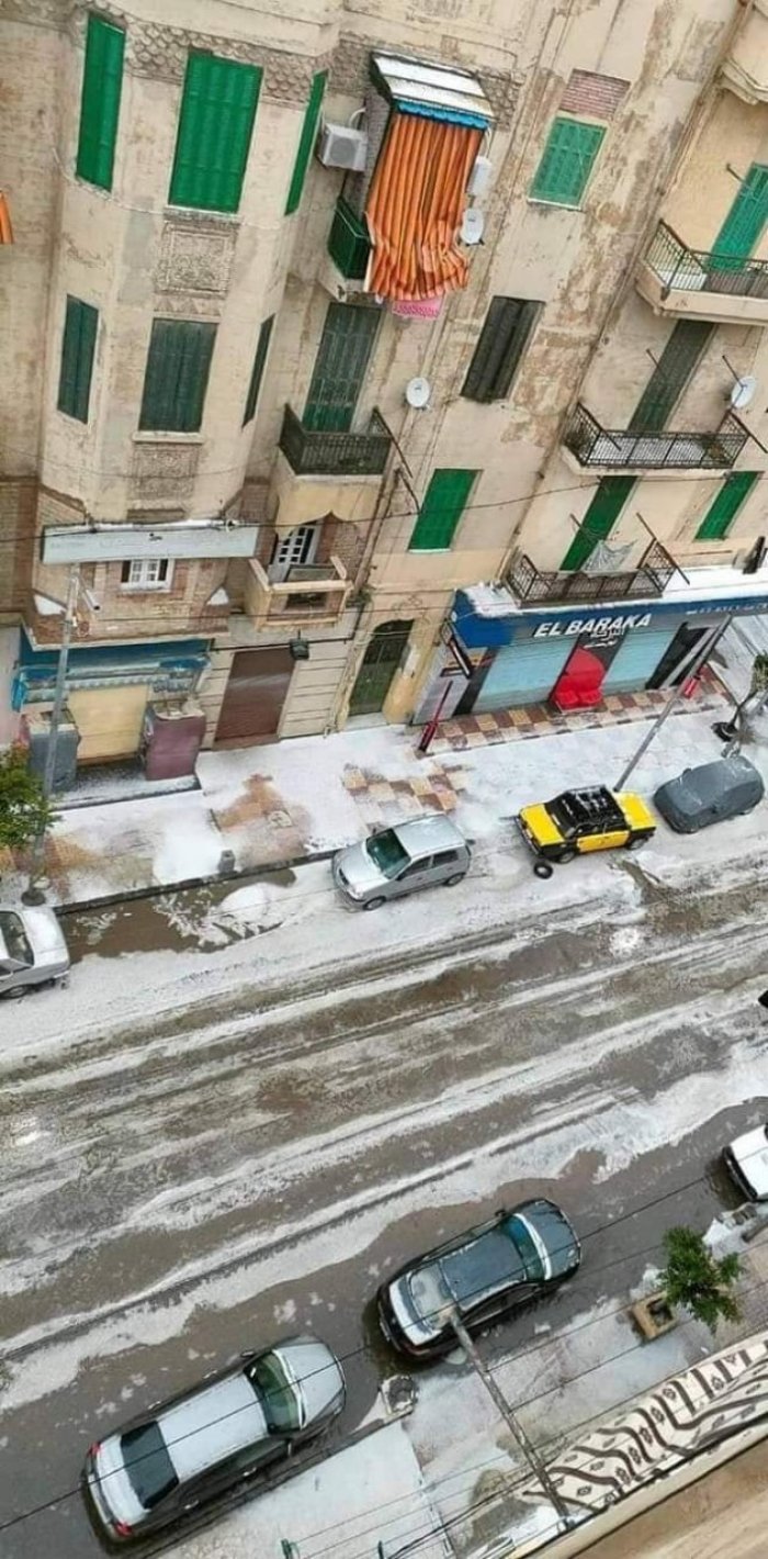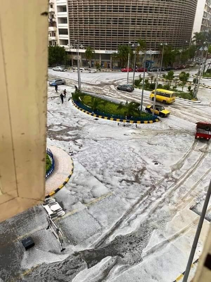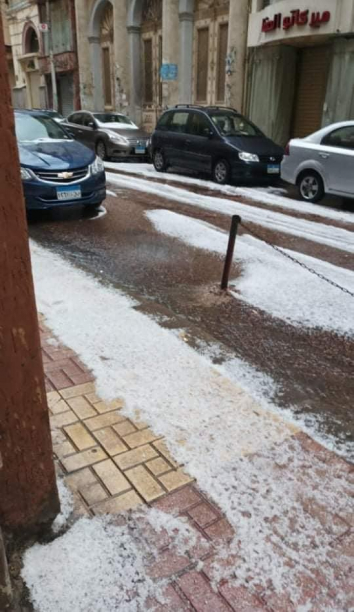 وتشهد الإسكندرية موجة من الطقس السيئ، يصاحبها هطول أمطار غزيرة ورياح باردة وانخفاض ملحوظ في درجات الحرارة وصل إلى حد الصقيع، وهو ما تسبب في أن تسكو الثلوج شوارعها، خاصة منطقة بحري بحي الجمرك.