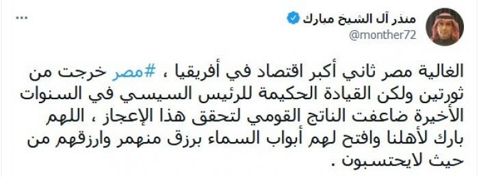 ثمّن المدون السعودي منذر آل الشيخ مبارك، جهود الرئيس عبدالفتاح السيسي، في النهوض بمصر اقتصاديا، بعد احتلت القاهرة المركز الثاني لأقوى اقتصاد في إفريقيا.