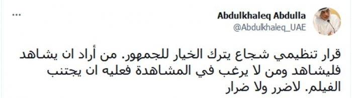 وقال في تغريدة عبر "تويتر"، اليوم: "قرار تنظيمي شجاع يترك الخيار للجمهور.. من أراد ان يشاهد فليشاهد ومن لا يرغب في المشاهدة فعليه أن يجتنب الفيلم.. لا ضرر ولا ضرار".
