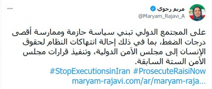 وكتبت في تغريدة عبر "تويتر"، اليوم: "علی المجتمع الدولي تبني سیاسة حازمة وممارسة أقصی درجات الضغط، بما في ذلك إحالة انتهاکات النظام لحقوق الإنسان إلی مجلس الأمن الدولي، وتنفیذ قرارات مجلس الأمن الستة السابقة".
