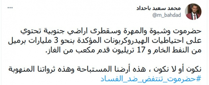 وتابع: "نكون أو لا نكون، هذه أرضنا المستباحة وهذه ثرواتنا المنهوبة"، مختتمة تغريدته بهاشتاج: "حضرموت تنتفض ضد الفساد".