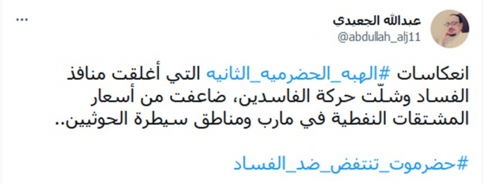 واختتم تغريدته بهاشتاج: "حضرموت تنتفض ضد الفساد".