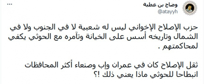 واستكمل: "ثقل الإصلاح كان في عمران وإب وصنعاء أكثر المحافظات انبطاحا للحوثي"، متسائلا: "ماذا يعني ذلك!؟".