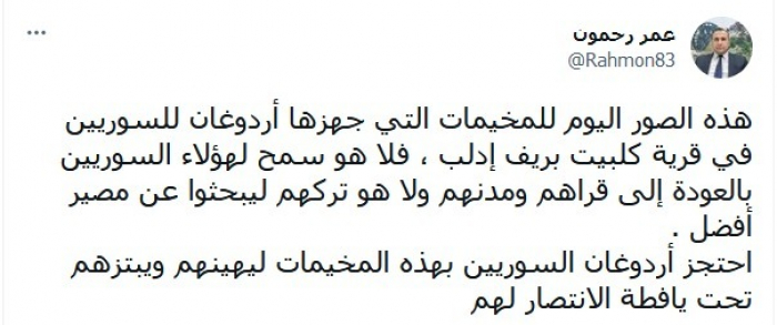 وأضاف: "لا هو سمح لهؤلاء السوريين بالعودة إلى قراهم ومدنهم ولا هو تركهم ليبحثوا عن مصير أفضل"، معتبرا أن احتجاز أردوغان للسوريين بهذه المخيمات إهانة وابتزاز يتحت يافطة الانتصار لهم.