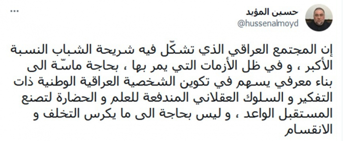 وأوضح في تغريدة عبر "تويتر"، اليوم: "المجتمع العراقي الذي تشكّل فيه شريحة الشباب النسبة الأكبر، وفي ظل الأزمات التي يمر بها، بحاجة ماسّة إلى بناء معرفي، وليس بحاجة إلى ما يكرس التخلف والانقسام".