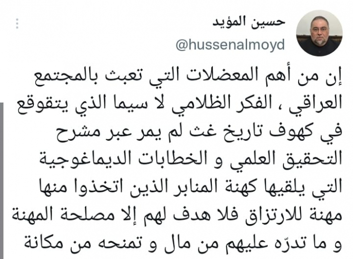 وأشار في تغريدة على حسابه بموقع التدوين المصغر تويتر، اليوم إلى أن: "من أهم المعضلات التي تعبث بالمجتمع العراقي، الفكر الظلامي لا سيما الذي يتقوقع في كهوف تاريخ غث لم يمر عبر مشرح التحقيق العلمي".