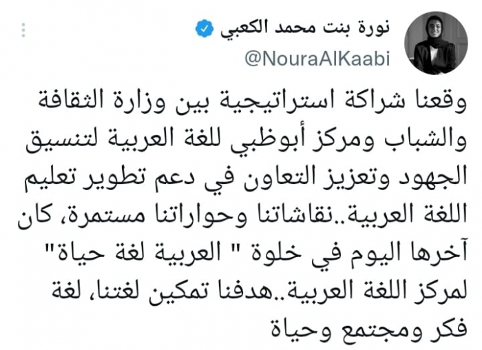 وقالت في تغريدة على حسابها بموقع التدوين المصغر تويتر، اليوم إننا: "وقعنا شراكة استراتيجية بين وزارة الثقافة والشباب ومركز أبوظبي للغة العربية لتنسيق الجهود وتعزيز التعاون في دعم تطوير تعليم اللغة العربية".