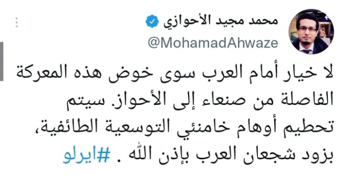 وأكد في تغريدة على حسابه بموقع التدوين المصغر تويتر، اليوم أنه: "لا خيار أمام العرب سوى خوض هذه المعركة الفاصلة من صنعاء إلى الأحواز".