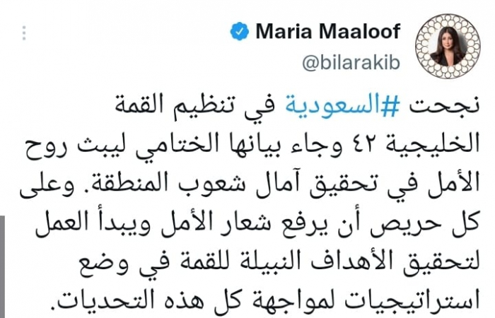ولفتت في تغريدة على حسابها بموقع التدوين المصغر تويتر، اليوم إلى أنه: "نجحت السعودية في تنظيم القمة الخليجية 42".