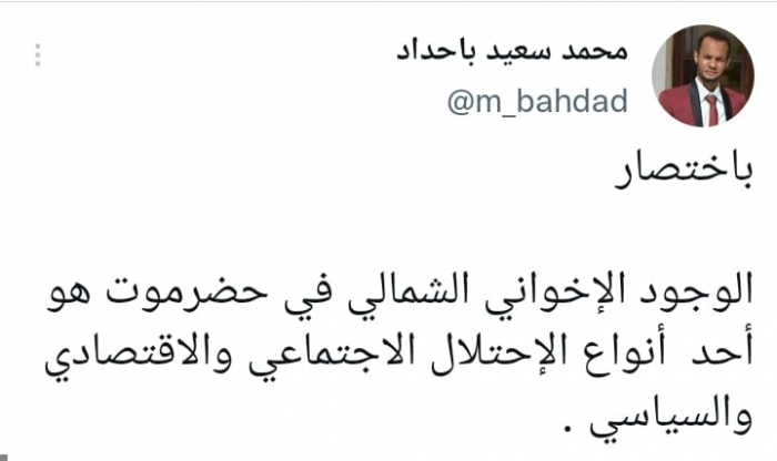 شدد الناشط السياسي محمد سعيد باحداد، على أن انتشار قيادات الإخوان من اليمنيين في حضرموت، بمثابة أحد أشكال الاحتلال اليمني بصورة اقتصادية واجتماعية.