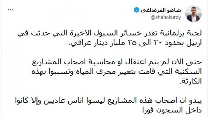 هاجم الكاتب الصحفي العراقي شاهو القرة داغي، الحكومة العراقية، لتقاعسها عن محاسبة أصحاب المشاريع السكنية الذين تسببوا في الكارثة الناتجة عن السيول بعدما غيّروا مجرى المياه في محافظة أربيل.