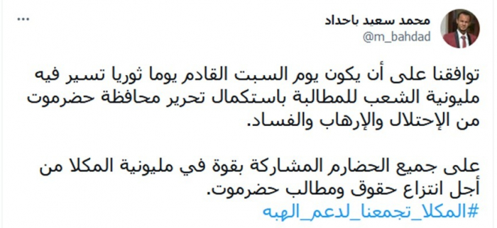وطالب: "جميع الحضارم المشاركة بقوة في مليونية المكلا من أجل انتزاع حقوق ومطالب حضرموت"، مختتما تغريدته بهاشتاج: "المكلا تجمعنا لدعم الهبة".