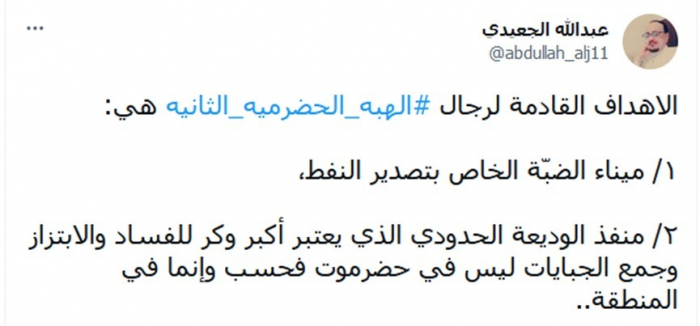 وبيّن في تغريدة عبر "تويتر"، اليوم: "الأهداف القادمة لرجال الهبة الحضرمية الثانية هي: