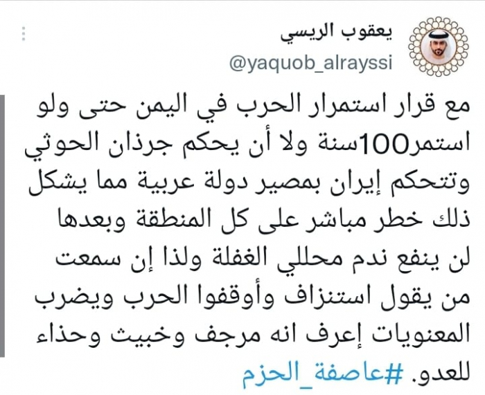وعبر في تغريدة على حسابه بموقع التدوين المصغر تويتر، اليوم أنه: "مع قرار استمرار الحرب في اليمن حتى ولو استمرت 100 سنة ولا أن يحكم جرذان الحوثي وتتحكم إيران بمصير دولة عربية".