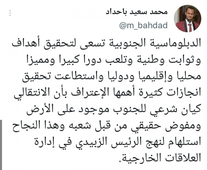 باحداد: هذه ثوابت الدبلوماسية الجنوبية ونجاحاتها بقيادة الانتقالي