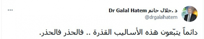 وكتب في تغريدة عبر "تويتر"، اليوم: "دائما يتبّعون هذه الأساليب القذرة .. فالحذر فالحذر"، في إشارة إلى محاولة الشرعية الإخوانية سرقة الهبة الحضرمية أو تفتيتها خاصة وأنه تم معارضتها في البداية خوفا من قوتها.