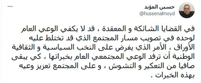 وأوضح في تغريدة عبر "تويتر"، اليوم: "في القضايا الشائكة و المعقدة، قد لا يكفي الوعي العام لوحده في تصويب مسار المجتمع الذي قد تختلط عليه الأوراق".