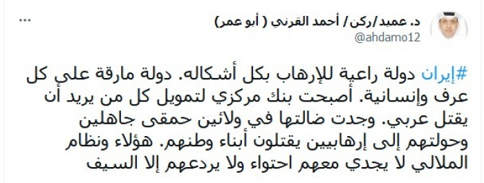 جاء ذلك في تغريدة عبر "تويتر"، اليوم، قائلا: "إيران دولة راعية للإرهاب بكل أشكاله.. دولة مارقة على كل عرف وإنسانية.. أصبحت بنك مركزي لتمويل كل من يريد أن يقتل عربي".