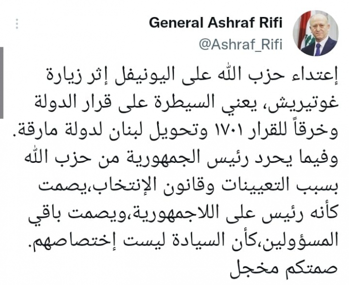 وأوضح في تغريدة على حسابه بموقع التدوين المصغر تويتر، اليوم أن: "اعتداء حزب الله على اليونيفل إثر زيارة غوتيريش، يعني السيطرة على قرار الدولة وخرقاً للقرار 1701 وتحويل لبنان لدولة مارقة".