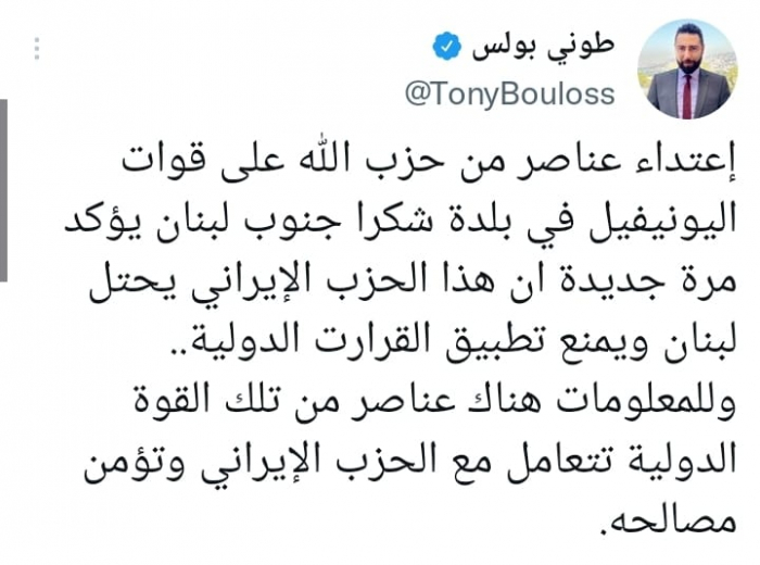 وأوضح في تغريدة على حسابه بموقع التدوين المصغر تويتر، اليوم أن: "اعتداء عناصر من حزب الله على قوات اليونيفيل في بلدة شكرا جنوب لبنان يؤكد مرة جديدة أن هذا الحزب الإيراني يحتل لبنان ويمنع تطبيق القرارت الدولية".