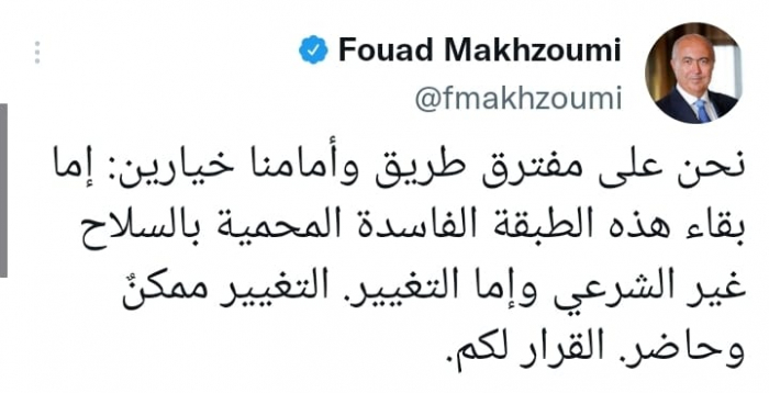 واستطرد: "إما بقاء هذه الطبقة الفاسدة المحمية بالسلاح غير الشرعي وإما التغيير، التغيير ممكنٌ وحاضر"، مضيفا أن: "القرار لكم".