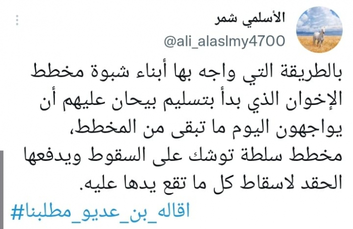 وكشف عن: "مخطط سلطة توشك على السقوط ويدفعها الحقد لإسقاط كل ما تقع يدها عليه"، مؤكدا أن: "إقالة بن عديو مطلبنا".
