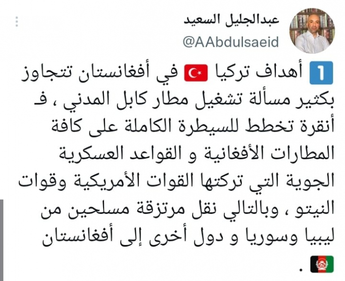 رأى الإعلامي السوري عبدالجليل السعيد أن تركيا تطمع في السيطرة على مطارات أفغانستان وقواعدها العسكرية لنقل العناصر المرتزقة إلى أفغانستان كقاعدة جديدة.