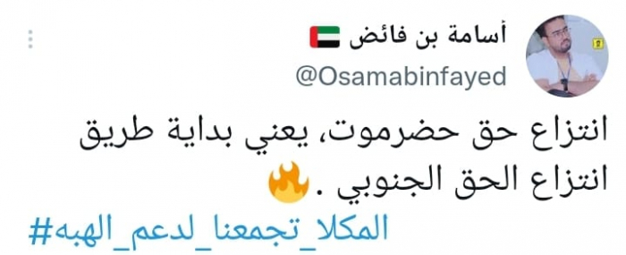 وشدد في تغريدة على حسابه بموقع التدوين المصغر تويتر، اليوم على أن: "انتزاع حق حضرموت، يعني بداية طريق انتزاع الحق الجنوبي"، مختتما بهاشتاج: "المكلا تجمعنا لدعم الهبة".