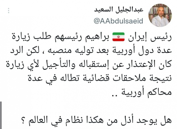 وأوضح في تغريدة على حسابه بموقع التدوين المصغر تويتر، اليوم أن: "رئيس إيران إبراهيم رئيسهم، طلب زيارة عدة دول أوروبية بعد توليه منصبه".