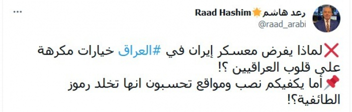 وتساءل في تغريدة عبر "تويتر"، اليوم: "لماذا يفرض معسكر إيران في العراق خيارات مكرهة على قلوب العراقيين؟، أما يكفيكم نصب ومواقع تحسبون أنها تخلد رموز الطائفية؟".