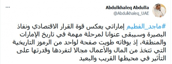 وذكر في تغريدة عبر "تويتر"، اليوم: "ماجد الفطيم إماراتي يعكس قوة القرار الاقتصادي ونفاذ البصيرة وسيبقى عنوانا لمرحلة مهمة في تاريخ الإمارات والمنطقة".