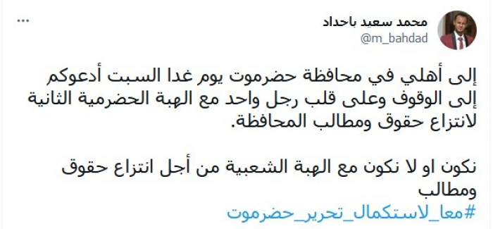 واستكمل: "نكون أو لا نكون مع الهبة الشعبية من أجل انتزاع حقوق ومطالب"، مختتما تغريدته بهاشتاج: "معا لاستكمال تحرير حضرموت".