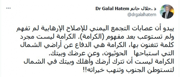 ولفت إلى أن: "الكرامة هي الدفاع عن أراضي الشمال التي استباحها الحوثيون، وعن عرضك وبيتك.. ليست أن تترك أرضك وأهلك وبيتك في الشمال لتستوطن الجنوب وتنهب خيراته".