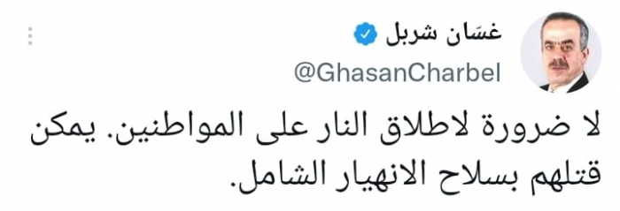 وقال في تغريدة على حسابه بموقع التدوين المصغر تويتر، اليوم إنه: "لا ضرورة لإطلاق النار على المواطنين، يمكن قتلهم بسلاح الانهيار الشامل".