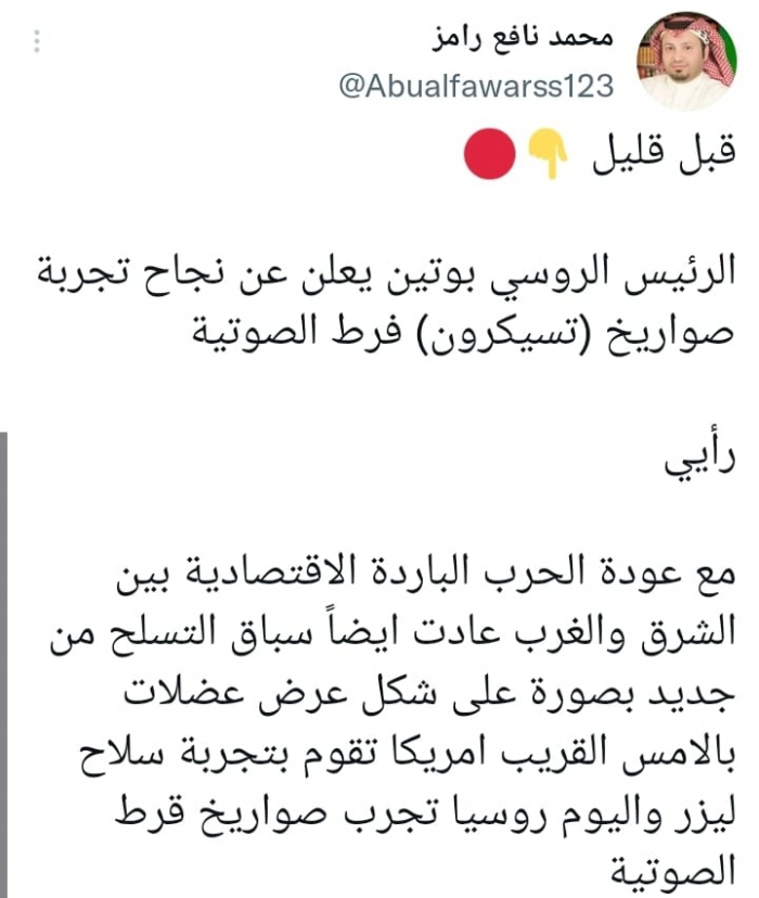 وقال في تغريدة على حسابه بموقع التدوين المصغر تويتر، اليوم إن: "قبل قليل، الرئيس الروسي بوتين يعلن عن نجاح تجربة صواريخ (تسيكرون) فرط الصوتية".